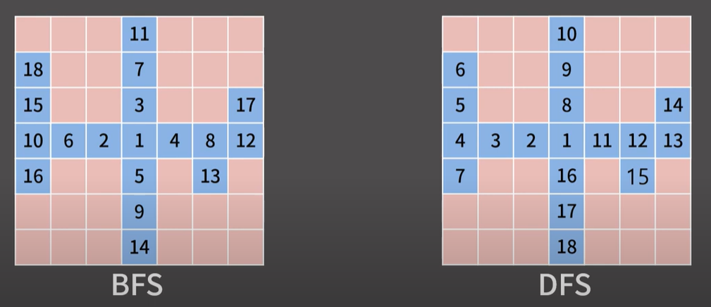 BFS는 한 칸 씩 인접칸으로 이동해가는 반면, DFS는 가능한 깊이있게 우선 탐색을 하기 때문에, 거리 측정이 불가능하다. BFS는 큐를 써서 이전에 탐색한 칸과 가장 가까운 칸이 먼저 처리되지만, DFS는 일단 깊이 우선으로 냅다 파고보기 때문이다. (아래 그림 참고)