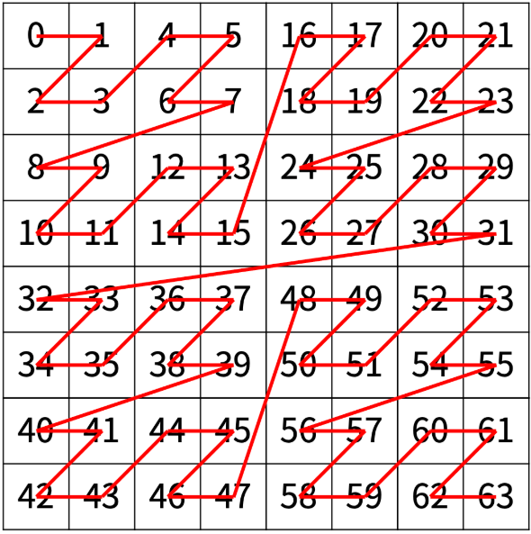 해당 그림은 n=3인 경우의 그림이다. 8X8칸을 빨간 선으로 4분면으로 나눠보았다 각 사분면에 같은 색으로 동글동글 칠해놓은 애들을 주목하자! 사분면을 기준으로 동일한 지점에 위치하는 요 동글동글 친구들은 이동 횟수에 규칙이 보인다 ! 파랑이에 16칸 더하면 보라색이고, 마찬가지로 보라색에 16칸 더하면 빨강, 거기에 +16칸하면 노랑이 된다. 당연하면서도 새로운 발견이다 !!